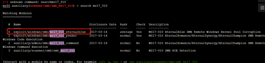 终端内输入 use auxiliary/scanner/smb/smb_ms17_010